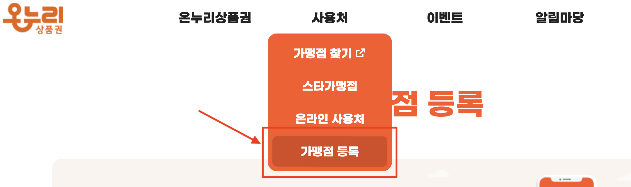 - 온누리상품권 홈페이지 접속 → 회원가입 및 로그인 → '사용처' 메뉴 선택 → ‘가맹점 등록’ 선택 → 신청서 및 서류 업로드 → 완료